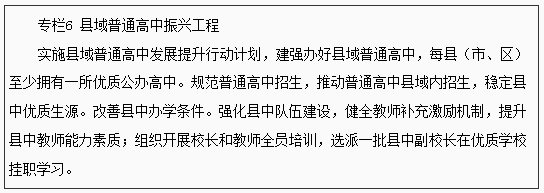 ——高中阶段教育高质量多样化格局基本形成。全面普及高中阶段教育,毛入学率达到96%。普通高中多样化、特色化发展格局基本形成,中等职业学校基本办学条件达到国家规定标准,普通高中教育和中等职业教育协调发展,总体保持规模大体相当。
