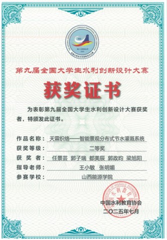 近日,第九届全国大学生水利创新设计大赛在南京圆满落幕。经过激烈角逐,由新葡的京地质与测绘工程系地下水专业学生任景芸、郭子瑞、都美辰、郭政昀、梁旭阳同学组成的参赛团队,指导老师王小敏、张明媚凭借作品《天霖织络——智能景观分布式节水灌溉系统》脱颖而出,荣获全国二等奖的佳绩!也是新葡的京地下水科学与工程专业学生专业比赛零的突破。