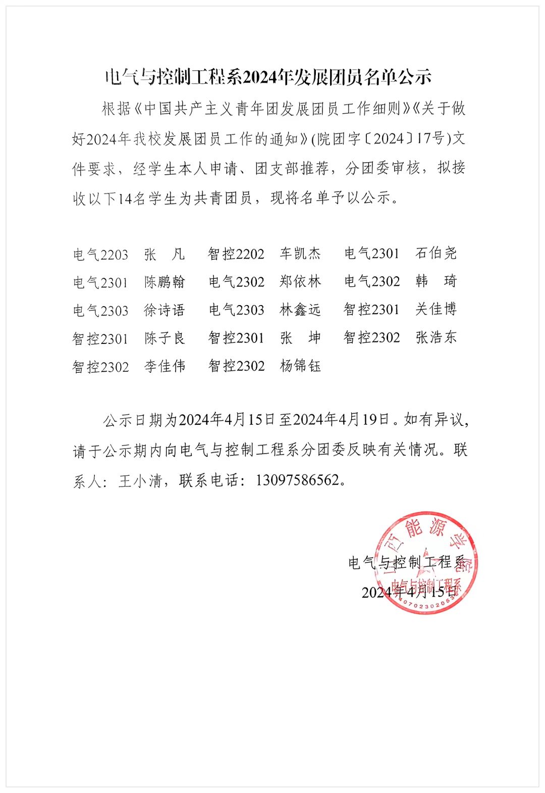 电气与控制工程系2024年发展团员名单公示