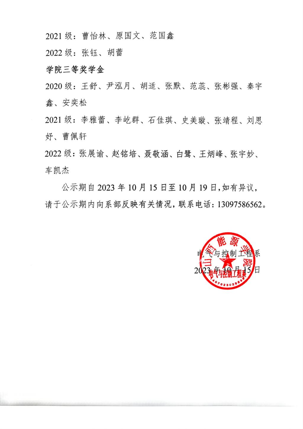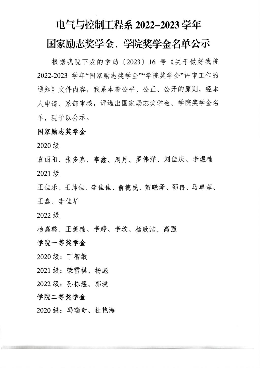 电气系2022-2023学年国家励志奖学金、学院奖学金名单公示