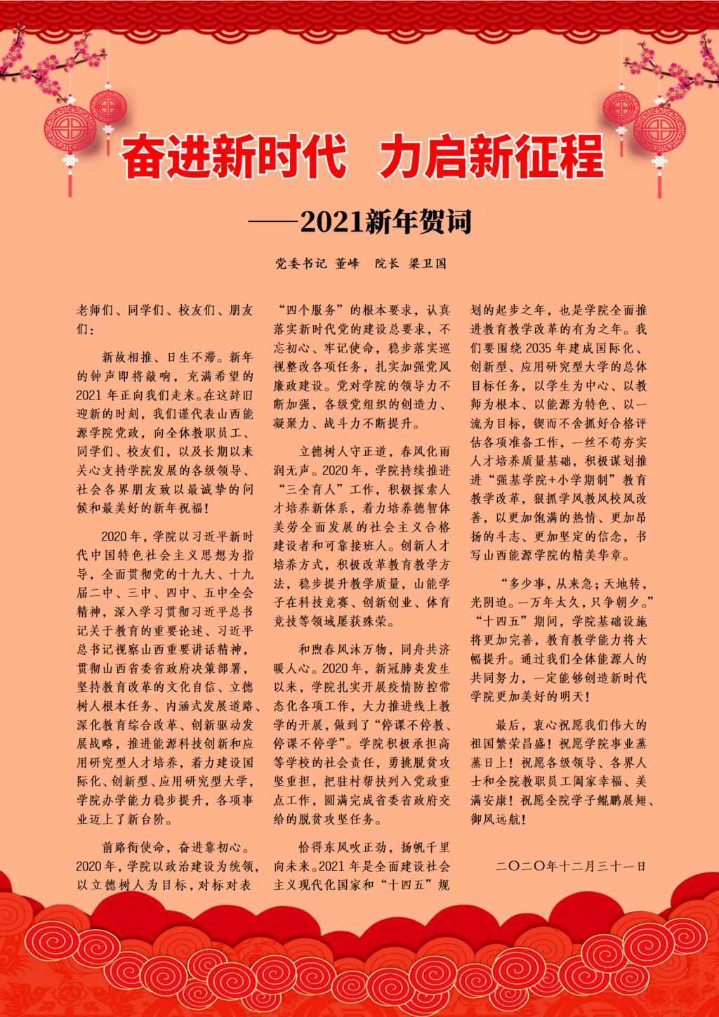 新故相推,日生不滞。新年的钟声即将敲响,充满希望的2021年正向我们走来。在这辞旧迎新的时刻,我们谨代表新葡的京集团3512vip官网党政,向全体教职员工、同学们、校友们,以及长期以来关心支持学院发展的各级领导、社会各界朋友致以最诚挚的问候和最美好的新年祝福!