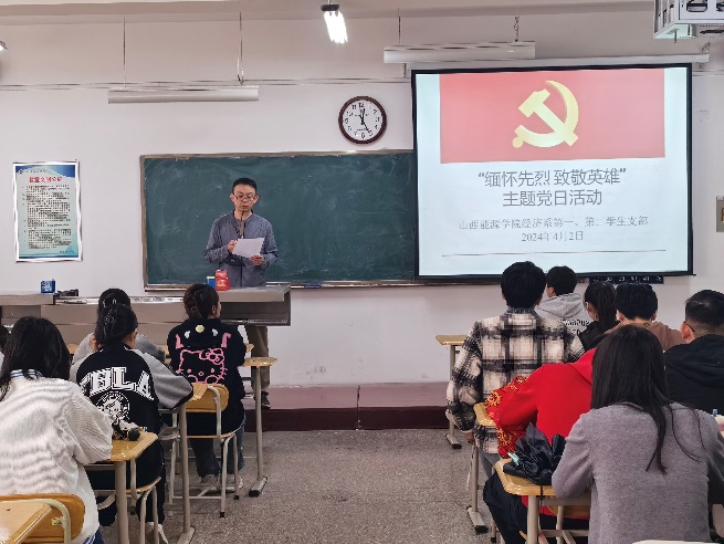 人间三月芳菲始,又是一年清明时。为悼念革命烈士,缅怀先烈的丰功伟绩,教育引导支部全体学生党员学习革命先烈的大无畏的奉献精神,继承革命先烈的光荣传统,弘扬民族精神,继承先烈遗志,4月3日,经济系第一,第二学生支部开展“缅怀先烈 致敬英雄”主题党日活动。