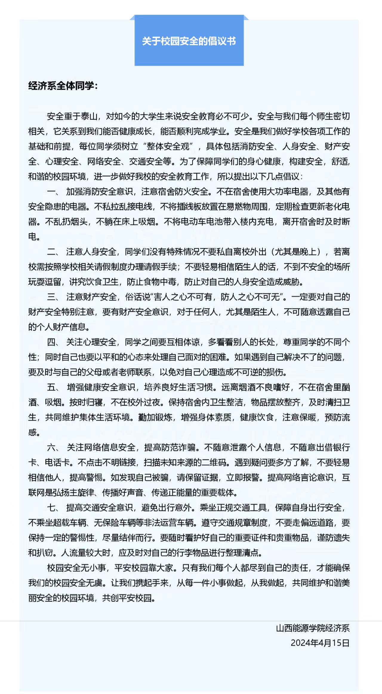经济系校园安全倡议书,请查收!