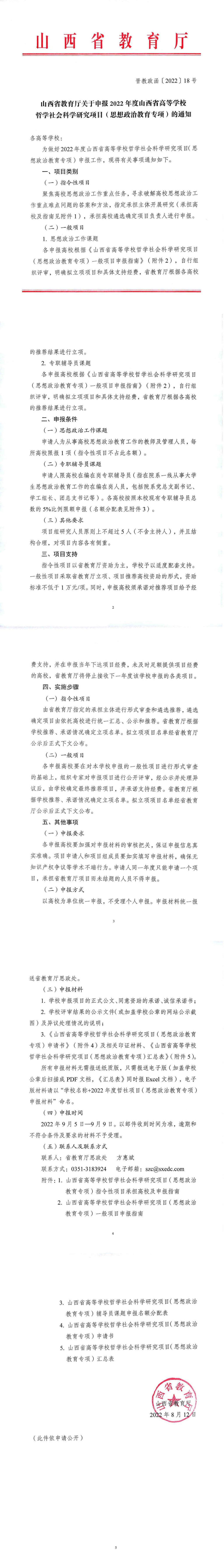 山西省教育厅关于申报2022年度山西省高等学校哲学社会科学研究项目(思想政治教育专项)的通知已经下发,详情如下。请于9月2日前将申请书2份报送至综合楼7层科技产业部,申请书、汇总表电子版文件发送至邮箱:kjcyb@sxie.edu.cn。