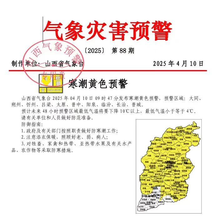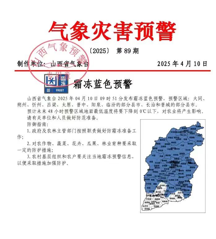 山西省气象台2025年04月10日16时34分发布大风蓝色预警,预警区域:全省。4月11日至13日,受较强冷空气影响,我省将出现大风、寒潮和霜冻天气,部分地区伴有沙尘。过程期间,全省有6~7级、短时9~11级或以上西北风,部分地区伴有浮尘或扬沙;气温明显下降,过程降温幅度10℃~14℃,局地可超16℃,最低气温出现在12日早晨,北部高寒地区-12℃左右,北部其余地区和中南部山区-8℃~-6℃,中南部其余地区-2℃~5℃;12日和13日早晨,北中部大部和南部部分地区将出现霜冻。
