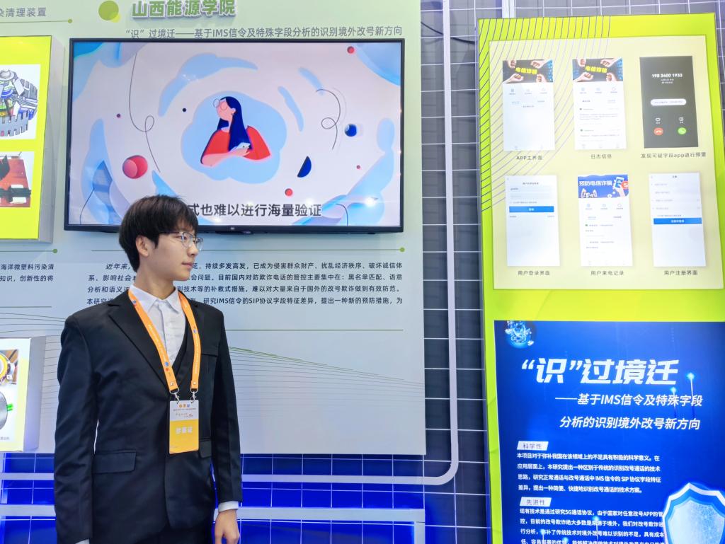 新葡的京学子通过展板与LED屏对项目进行讲解,向参展人员展示“山能防诈骗App”的经济价值和社会效益。